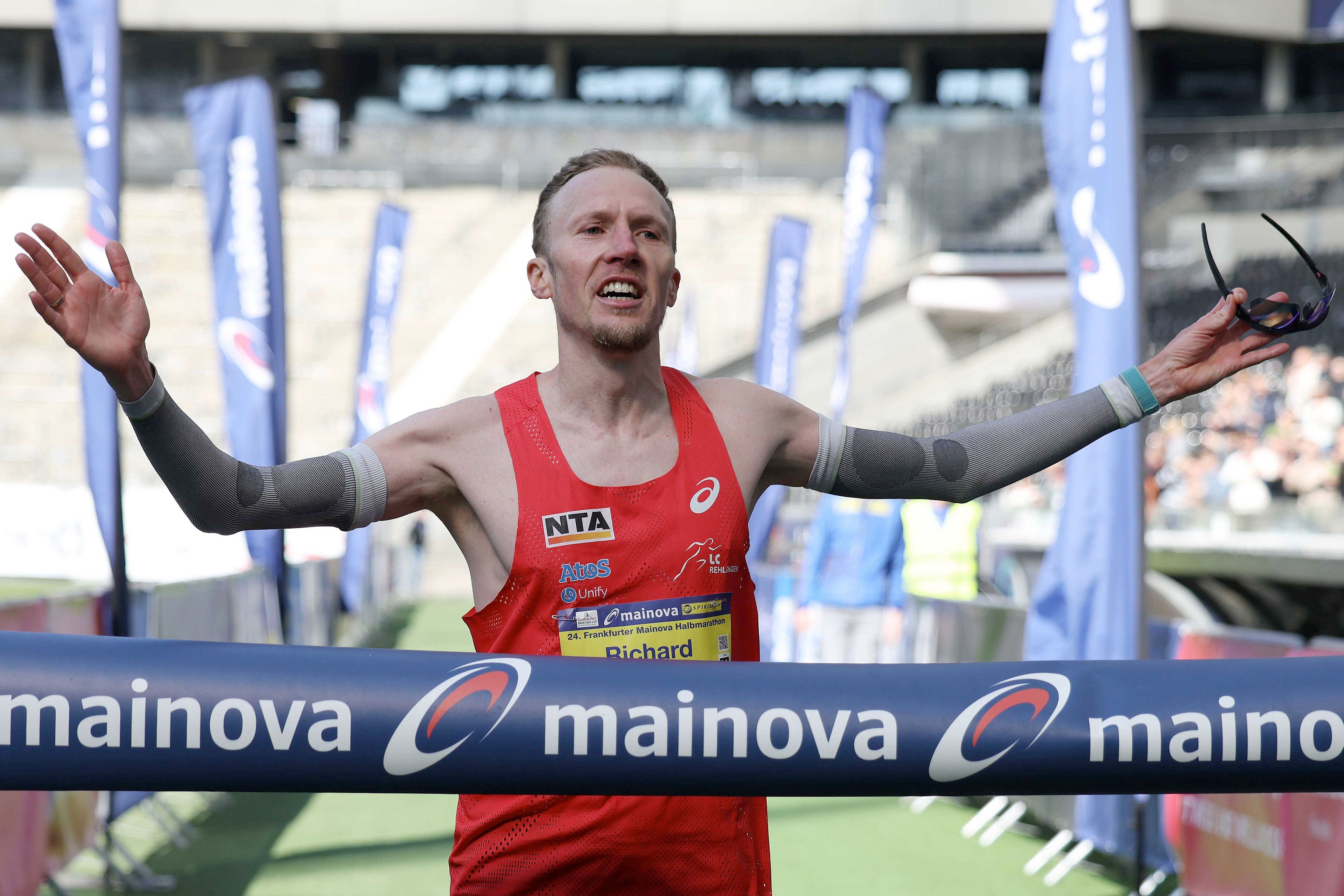 Bei den Deutschen Meisterschaften im Halbmarathon, die am Sonntag (22.3.26) in Frankfurt im Rahmen des Mainova Halbmarathons ausgetragen wurden, gewann Richard Ringer seine nächsten DM-Titel. Nach verhaltenem Beginn rannte der 37-Jährige auf der zweiten Streckenhälfte den 6.483 Konkurrenten auf und davon. Nach 21,1 Kilometern und 63:26 Minuten lief er mit einem Vorsprung von 58 Sekunden vor Tom Thurley (Munich Athletics) ins Ziel. Für den Marathon-Europameister und Olympia-Zwölften war dies der nächste Deutsche Meistertitel, nachdem er zuletzt 2024 im 10-Kilometer-Straßenlauf siegreich gewesen war. In Frankfurt wurde er ein zweites Mal mit Gold dekoriert, weil er neben dem Aktiven-Titel auch die M35-Klasse gewonnen hatte. Aber wie kam es, dass der Rehlinger für die ersten 5 Kilometer 15:50 Minuten benötigte und im “Elitefeld“ mit einem Rückstand von 45 Sekunden nur an 14. Position rangierte? Auch bei 10 Kilometern war es nicht viel besser. Mit 30:34 Minuten lag er in einer achtköpfigen Verfolgergruppe an letzter Stelle. Die Spitzengruppe aus vier Läufern hatte 25 Sekunden Vorsprung. „Ich habe heute einen progressiven „Long-run“ gemacht“, lautete später die Erklärung des Meisters. „Vor dem Start hatte ich ein Warm-Up von vier Kilometern, dann vier Kilometer gleichmäßig in 3:22 Minuten. Nach dem Start bin ich erst mal ein Tempo um 3:10 bis 3:15 Minuten gelaufen. Der Rückstand war geplant. Dann wurde ich sukzessiv schneller bis zur Höchstgeschwindigkeit von unter 2:50 Minuten. Mein Coach Tim Moriau wollte lieber ein gutes Training als einen müden Athleten.“ Bei Kilometer 14 erreichte Richard die Spitzengruppe, ab Kilometer 15 (bei 45:17 Minuten) übernahm er die Führung, die er kontinuierlich ausbaute. Die 20 Kilometern passierte er in exakt 60 Minuten mit einem Vorsprung von 53 Sekunden. Der “Trainingslauf“ war Teil der Vorbereitung auf den bedeutenden Marathonlauf in Boston (USA), der in vier Wochen ansteht. „Die nächsten zweieinhalb Wochen sind wichtig. Heute ging es nur um den Titel, nicht um die Zeit.“ Richards Bestzeit und Saarlandrekord steht seit einem Jahr bei 60:51 Minuten.